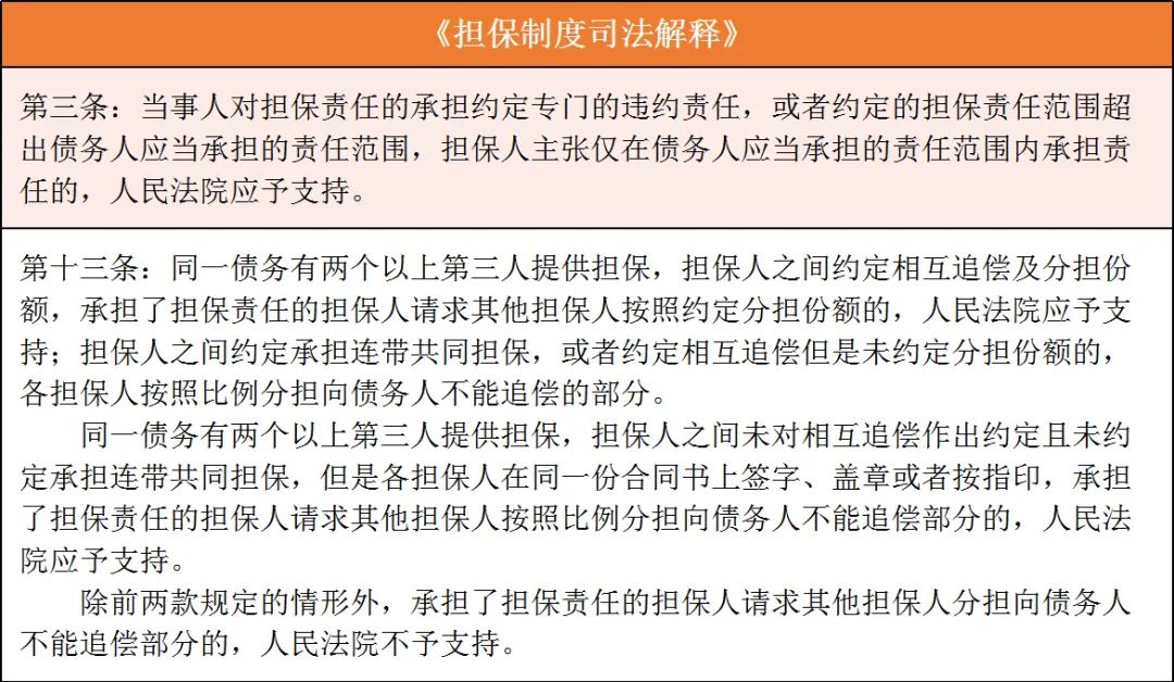 (3)超出責(zé)任范圍免責(zé):擔(dān)保人對超出債務(wù)人應(yīng)當(dāng)承擔(dān)的責(zé)任范圍以外的債務(wù),不承擔(dān)擔(dān)保責(zé)任。同一債務(wù)有兩個(gè)以上第三人提供擔(dān)保,擔(dān)保人之間沒有約定相互追償及分擔(dān)份額,也沒有在同一份合同書上簽字、蓋章或者按指印,承擔(dān)了擔(dān)保責(zé)任的擔(dān)保人請求其他擔(dān)保人分擔(dān)向債務(wù)人不能追償部分的,人民法院不予支持。