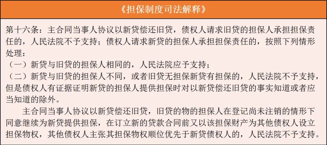(2)“借新還舊”免責(zé):在借新還舊的情形中,新貸貸款合同實(shí)質(zhì)上僅產(chǎn)生債務(wù)人還款之義務(wù)而無債權(quán)人貸款之義務(wù),顯然,擔(dān)保人在此情形所負(fù)擔(dān)的擔(dān)保風(fēng)險(xiǎn)高于舊貸以及其他一般借貸關(guān)系,故為保障擔(dān)保人的合法權(quán)益,借新還舊的擔(dān)保規(guī)則對新貸擔(dān)保人作出一定保護(hù)性規(guī)定。