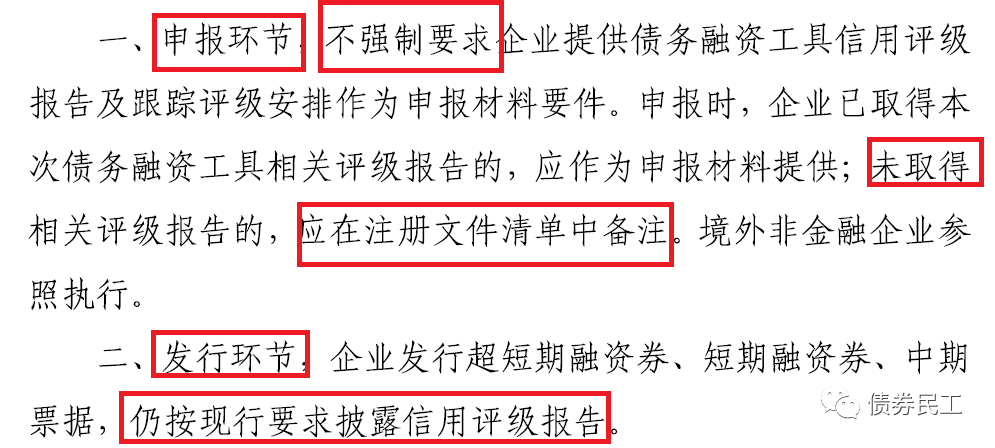 按照交易商協(xié)會(huì)之前的監(jiān)管政策,公開發(fā)行的債務(wù)融資工具(中期票據(jù)、短期融資券和超短期融資券),在注冊(cè)環(huán)節(jié)需要提交評(píng)級(jí)報(bào)告作為申報(bào)材料。此次新規(guī)出臺(tái)之后,可以將債務(wù)融資工具企業(yè)評(píng)級(jí)選擇權(quán)交予市場決定。