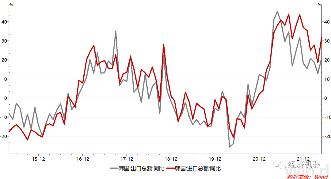 不過,5月,韓國貿易進出口出現大幅改善。其中,出口同比增速達21.3%,較上月提升8.4個百分點,為年內最高水平。進口同比增速達32%,較上月提升13.4個百分點,也是年內次高值(圖7)。這可能預示著外部需求短期內局部有所回穩。