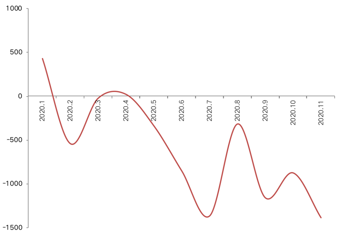 圖:2020年1-11月全國信托貸款增量(單位:億元)