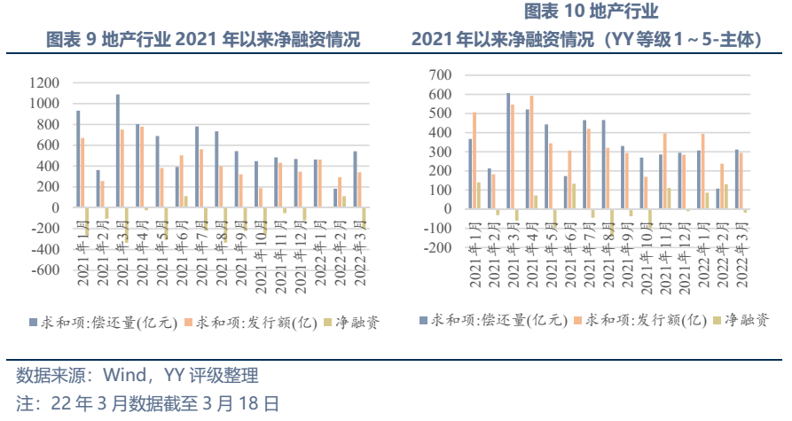 因此近年來房地產企業面臨從經營端到融資端的前后夾擊,其中經營端包括限購、限貸、限價、減緩備案、預售資金監管等,融資端包括打擊信托融資、三道紅線、銀行貸款集中度管理等,融資壓力下房企拿地熱情下降,第二輪、第三輪土拍遇冷,土拍價格走低意味著房企手中的存貨價值縮水,房企債務壓力進一步加大,拿地積極性進一步降低…且在此過程中,不僅原本財務結構欠穩健的企業風險直接被刺破,一些相對面臨融資環境沒那么惡劣的企業也開始收縮杠桿,21年下半年YY等級1~5-投資級地產主體凈融資-226億元。