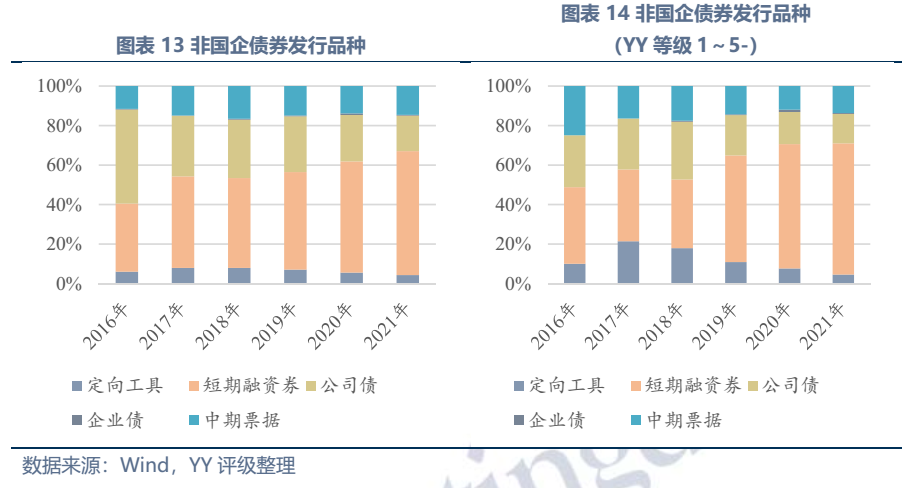另外,從發行品種來看,無論是全部非國企還是投資級非國企,近年來發行短期融資券的比例都逐年提升,2021年短期融資券在全部非國企、投資級非國企新發債券中的比例分別高達62.7%、66.4%。尾部民企短期融資券發行占比提升主要是發行長期限品種較難,而對于信用資質較好的民企,其發行長期限品種減少或反映民企債權融資用途愈來愈集中于籌集日常運營資金,而進行長回報期資產投資的意愿下降。