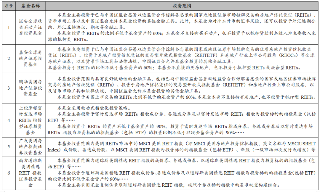由于國(guó)內(nèi)目前并沒(méi)有真正意義上的REITs,投資者主要通過(guò)借道QDII基金投資的海外REITs。據(jù)小編查詢,國(guó)內(nèi)市場(chǎng)投資REITs的公募基金共6只,均為QDII基金(其中3只為被動(dòng)式指數(shù)基金)。境外REITs和境內(nèi)基礎(chǔ)設(shè)施REITs本質(zhì)相同,通過(guò)QDII基金的資產(chǎn)配置策略可以了解REITs基礎(chǔ)資產(chǎn)的研判要點(diǎn),亦可以作為承做端的重要參考。