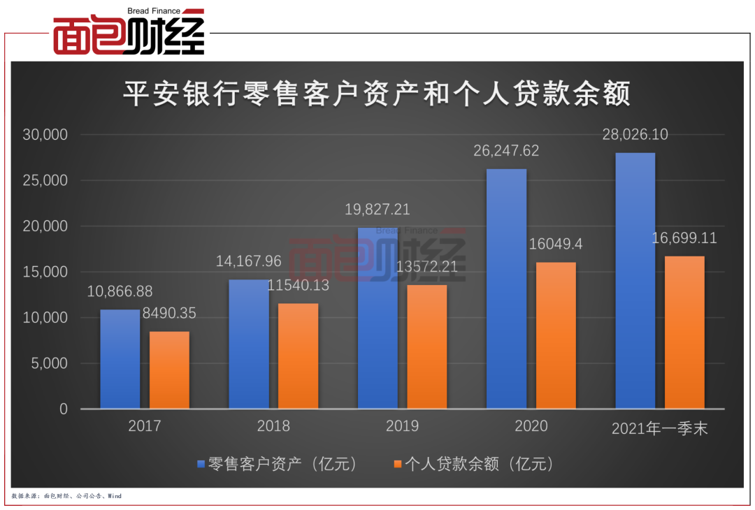 整體業績的增長與該行近幾年持續的零售轉型不無關系。截至2021年3月末,該行管理的零售客戶資產(AUM)達28,026.10億元,較上年末增長6.8%;零售客戶數11,039.94萬戶,較上年末增長3.0%。