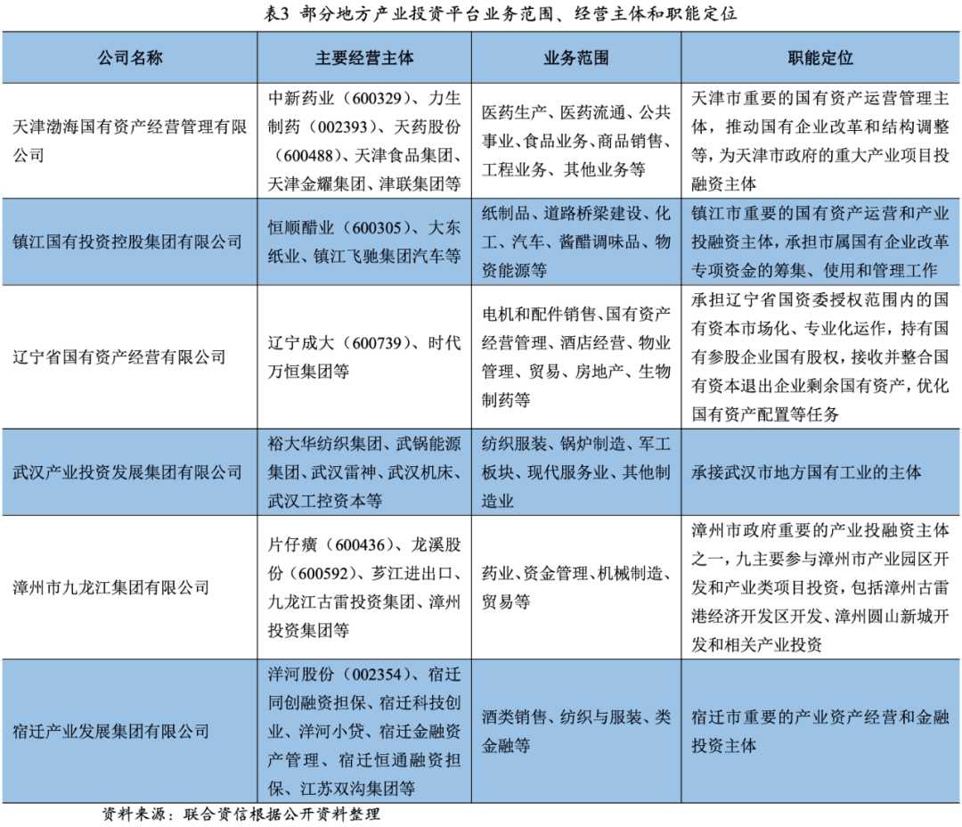 隨著國(guó)企改制、國(guó)有資本運(yùn)營(yíng)公司的組建和城投平臺(tái)的轉(zhuǎn)型,地方產(chǎn)投平臺(tái)的數(shù)量近年來(lái)不斷增加。不同于業(yè)務(wù)集中度高的經(jīng)營(yíng)性國(guó)有集團(tuán)和典型的城投平臺(tái),地方產(chǎn)投平臺(tái)通常是指建立在當(dāng)?shù)卣畡潛艿慕?jīng)營(yíng)性資產(chǎn)之上,結(jié)合地方產(chǎn)業(yè)資源和產(chǎn)業(yè)發(fā)展規(guī)劃,承擔(dān)引導(dǎo)當(dāng)?shù)刂攸c(diǎn)產(chǎn)業(yè)投資發(fā)展、政府指定項(xiàng)目投融資、國(guó)企混改以及國(guó)有資產(chǎn)增值保值等特殊職能的地方國(guó)有企業(yè)。