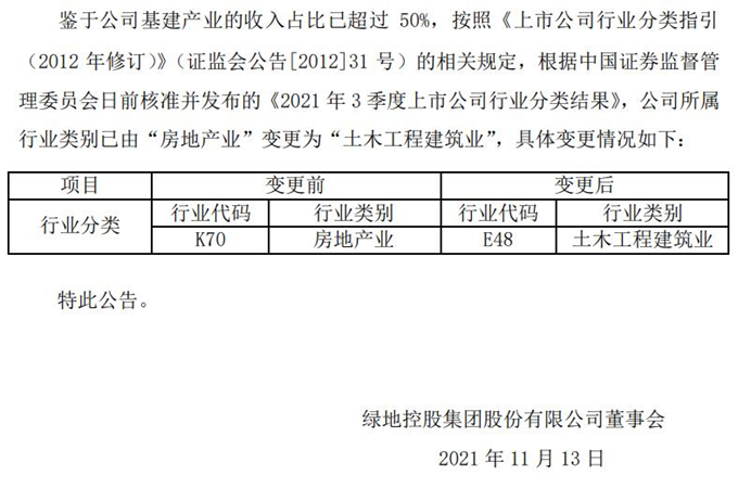 11月12日,綠地控股集團(tuán)股份有限公司發(fā)布公告稱(chēng),公司所屬行業(yè)類(lèi)別已由“房地產(chǎn)業(yè)”變更為“土木工程建筑業(yè)”。