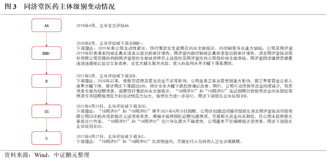 2021年4月25日,同濟堂醫藥有限公司(簡稱“同濟堂醫藥”)兩只存續債券發生違約,違約規模合計約4.6億元。同濟堂,僅在2018年發行了兩只公募公司債,2019年欲發行債券,后公告延期發行后再無進展,當年共有3.13億元銀行借款發生違約,風險已顯露。2020年8月,公司主體等級由AA被調降至BBB-,并列入觀察名單。