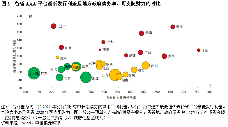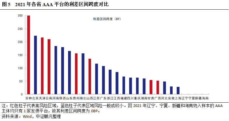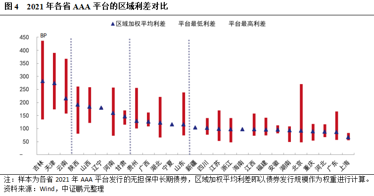 東北和西部經濟弱省的AAA平臺區域利差普遍很高;多數中部和東部省份的區域利差適中。