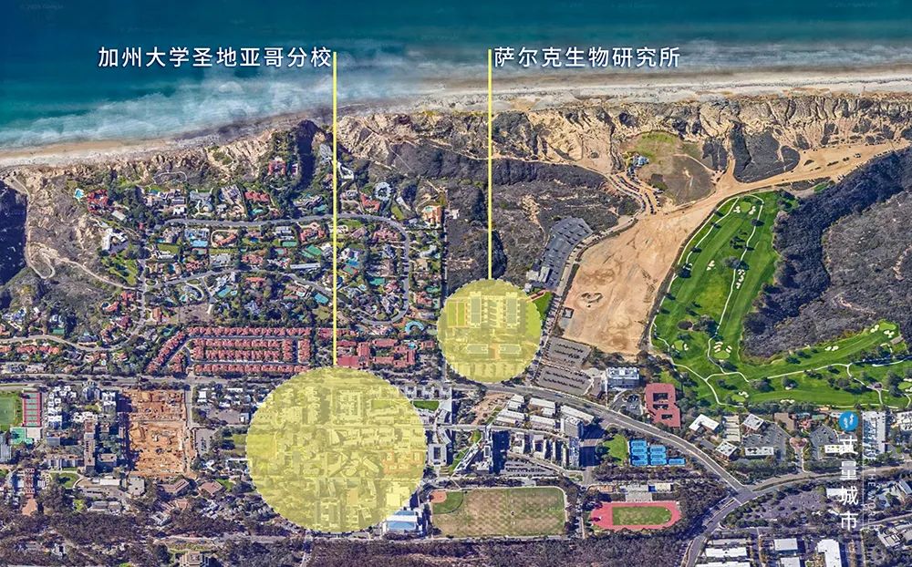 ▼ 薩爾克生物研究所和加州大學(xué)圣地亞哥分校的區(qū)位關(guān)系示意