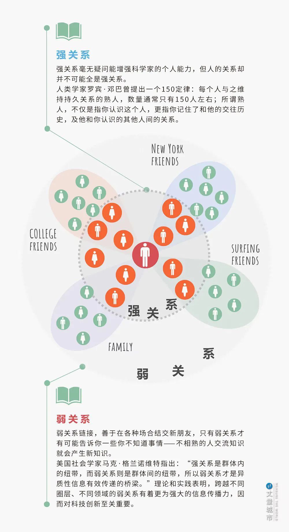 而更重要的是,在城市中心可以見(jiàn)到更多、更多元的人——這對(duì)于科學(xué)家的「跨界交流」實(shí)在太重要了。可以說(shuō),城市中心具有構(gòu)成「跨界交流」的先天優(yōu)勢(shì)——容易形成「弱關(guān)系」網(wǎng)絡(luò)。那么什么是「弱關(guān)系」?