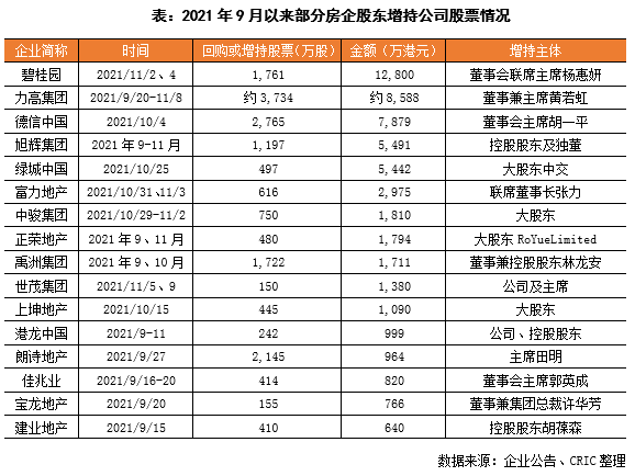 除了提前贖回部分境外債之外,9月以來多家房企大股東增持公司股票,進(jìn)行市值維護(hù),增添市場信心。據(jù)不完全統(tǒng)計(jì),2021年9月以來,就有17家房企的大股東等通過對公司股票進(jìn)行增持。其中碧桂園楊惠妍在11月累計(jì)增持碧桂園股票不小于1761萬股,金額1.28億元,力高集團(tuán)黃若虹自9月20日起累計(jì)增持約3734萬股,持股比例由29.49%上升到40.0%。