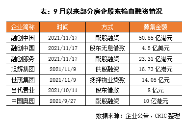 除了進(jìn)行股票增持的操作,部分股東還為企業(yè)提供股東借款融資,據(jù)不完全統(tǒng)計(jì),融資主要集中在股東借款、配股融資、抵押物業(yè)借款等,除了提振市場信心,也為公司注入資金,增強(qiáng)企業(yè)流動(dòng)性。當(dāng)代置業(yè)、融創(chuàng)中國的股東分別為公司提供了8億元、4.5億美元的股東借款。而旭輝集團(tuán)發(fā)布公告稱,以供股的方式發(fā)行最多約4.18億新股,募集約16.73億港元,大股東林氏家族承諾將投入8.87億港元認(rèn)購2.22億股,并有意向額外投入最多7.86億港元進(jìn)行全額認(rèn)購,合計(jì)將最多投入16.73億港元用于助力公司的長期發(fā)展,以股東兜底的方式進(jìn)行融資。而融創(chuàng)中國、中國奧園則進(jìn)行了配股融資,其中融創(chuàng)募集金額達(dá)到50.85億港元。值得注意的是,股東借款及配股融資等方式,對股東以及企業(yè)自身發(fā)展前景要求較高,目前僅有少量房企進(jìn)行。