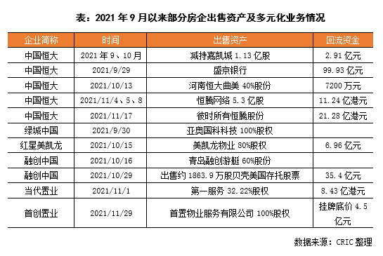 除了商廈、開發(fā)項(xiàng)目等資產(chǎn),企業(yè)還進(jìn)行多元化業(yè)務(wù)的出售。物業(yè)公司作為“現(xiàn)金奶牛”素來有較高的估值,進(jìn)行現(xiàn)金回流的速度相對較高,成為部分房企考慮出售的多元化資產(chǎn)之一,今年以來,藍(lán)光、富力、當(dāng)代、紅星美凱龍等企業(yè)完成了其旗下物業(yè)公司的出售,回流現(xiàn)金。此外,部分企業(yè)也出售了對外投資企業(yè)的股份,如融創(chuàng)出售約1863.9萬股貝殼美國存托股票,回流金額約35.4億元,恒大母公司廣州凱隆減持嘉凱城1.13億股,收回現(xiàn)金2.91億元。也有部分企業(yè)聚焦主業(yè),出售旗下其他多元化業(yè)務(wù),如融創(chuàng)、綠城分別出售了部分游艇及科技業(yè)務(wù)。