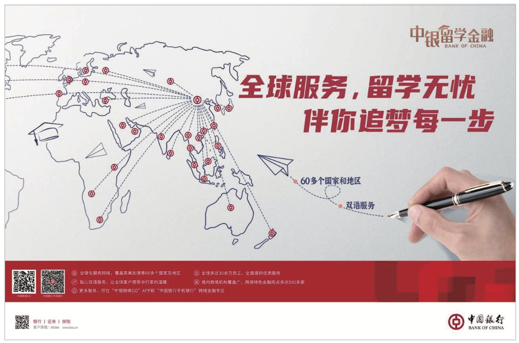在跨境金融領(lǐng)域,中行始終保持行業(yè)領(lǐng)先,服務(wù)了全國大約50%以上的留學(xué)家庭。目前,中行設(shè)立了500多個(gè)覆蓋全國的跨境金融中心,并擁有覆蓋英、美、澳、加等60多個(gè)國家和地區(qū)的全球化服務(wù)網(wǎng)絡(luò)。