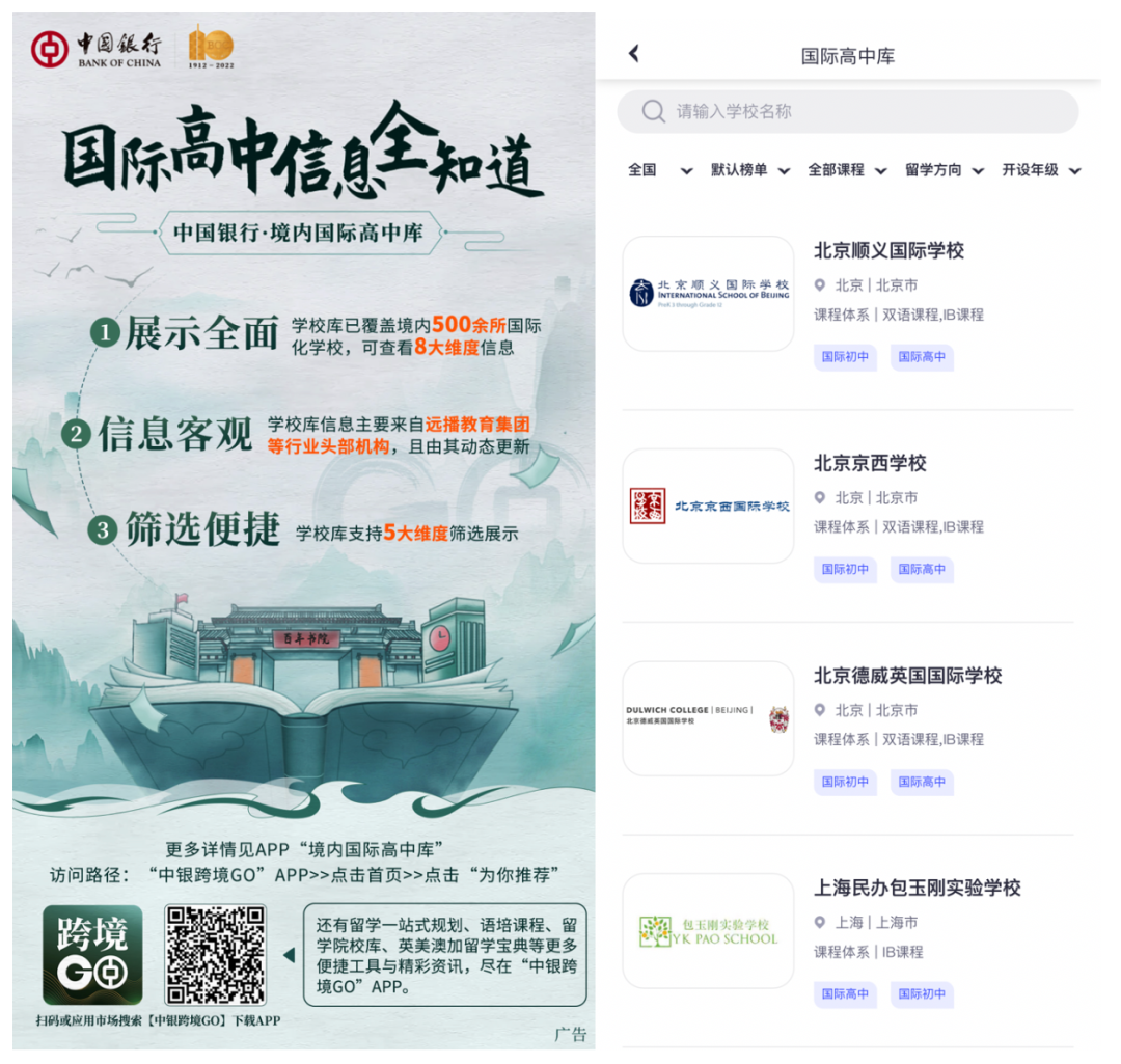 二是以人民為中心,服務(wù)跨境客戶。中行不但圍繞客戶及其子女在國內(nèi)教育的金融服務(wù),打造“教育場景”服務(wù),還圍繞客戶在國際化教育方面的實(shí)際需求,在前期已提供的境內(nèi)國際化學(xué)校排行榜、境內(nèi)國際高中庫等多元化非金融服務(wù)的基礎(chǔ)上,打造國際化學(xué)校擇校指南。