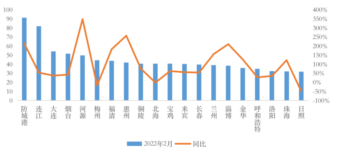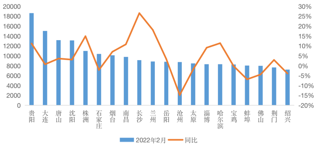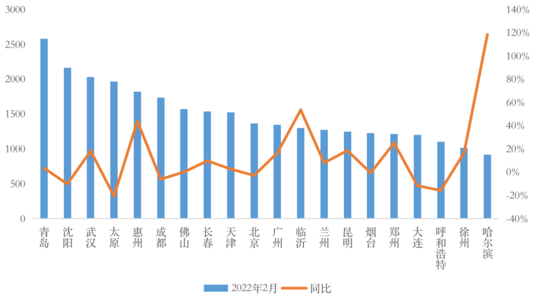 圖:2022年2月末商品住宅庫存量TOP20城市情況(單位:萬平方米)