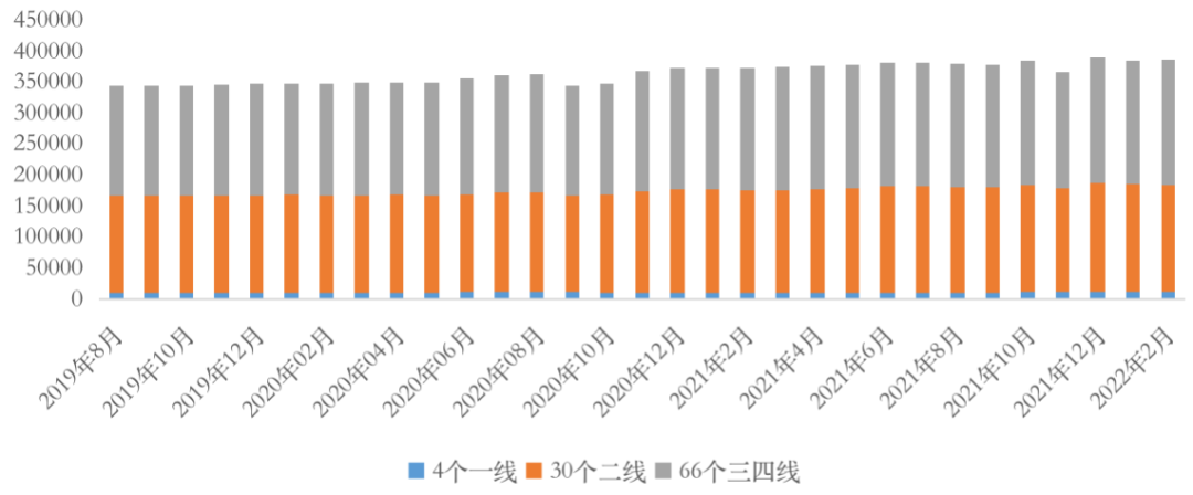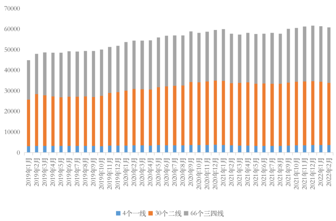 綜合來看,分化趨勢依舊:一線韌性較強,2月狹義庫存整體持穩,去化周期僅12.96個月,庫存風險基本可控;二線“中規中矩”,狹義庫存波動不大;去化周期雖然同環比齊增,但仍低于百城平均。三四線壓力陡增,狹義庫存、去化周期同比漲幅屬不同能級之首,顯著超百城平均,此外百城廣義庫存一半以上積壓在三四線城市,基數較大,短期內潛在庫存風險依舊較大。