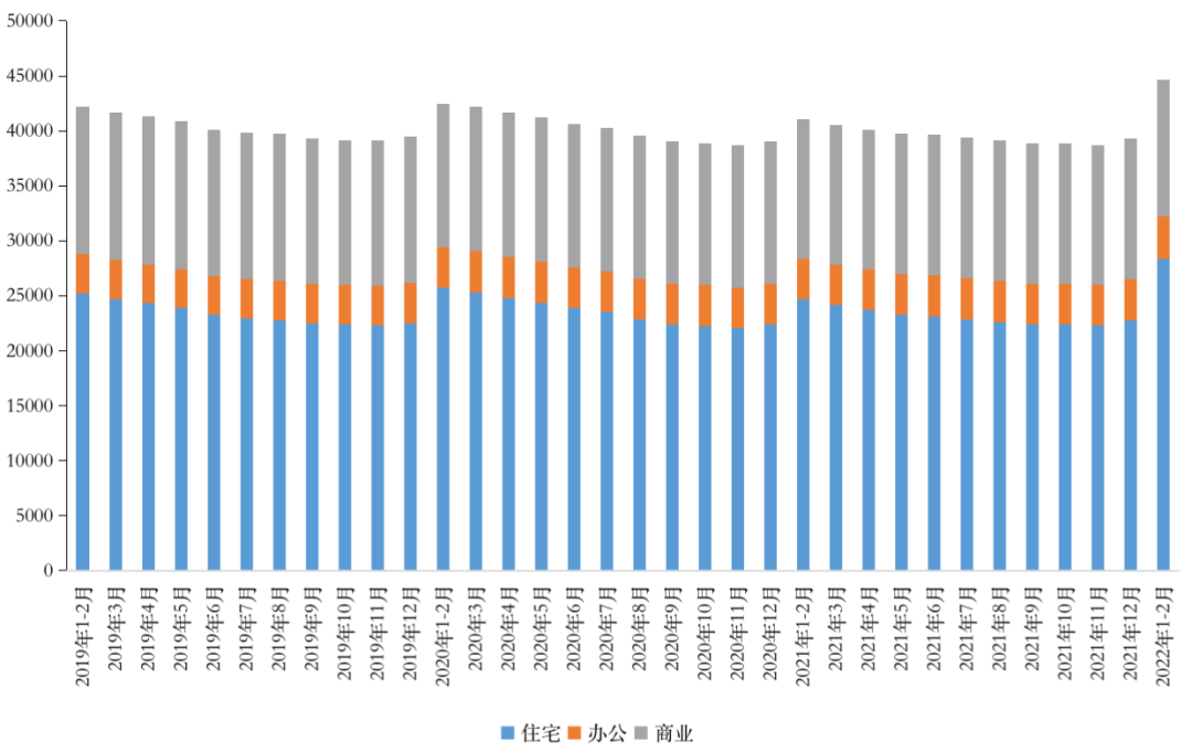 國家統計局公布數據顯示,截至2月末,商品房待售面積57026萬平方米,比2021年末增加6003萬平方米。其中,住宅待售面積增加5552萬平方米,辦公樓待售面積增加104萬平方米,商業營業用房待售面積減少335萬平方米。