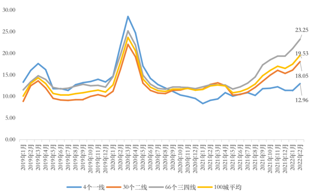從去化周期來看,庫存消化周期已持續增至19.5個月,不同能級城市皆保持上揚,一線增至12.96個月,二線增至18.05個月,同比漲幅均在40%以上,目前庫存風險基本可控,而三四線去化周期已達到23.25個月,迫近疫情期高位(25.18個月),顯著高于百城平均,去化風險浮出水面,同比增83%,居不同能級之首。
