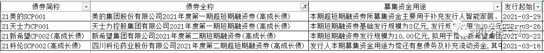 7、目前公告發(fā)行的高成長債債券期限以短期為主,21科倫SCP002(高成長債)為180天,21美的SCP001為178天,其余的債券期限均為1年。