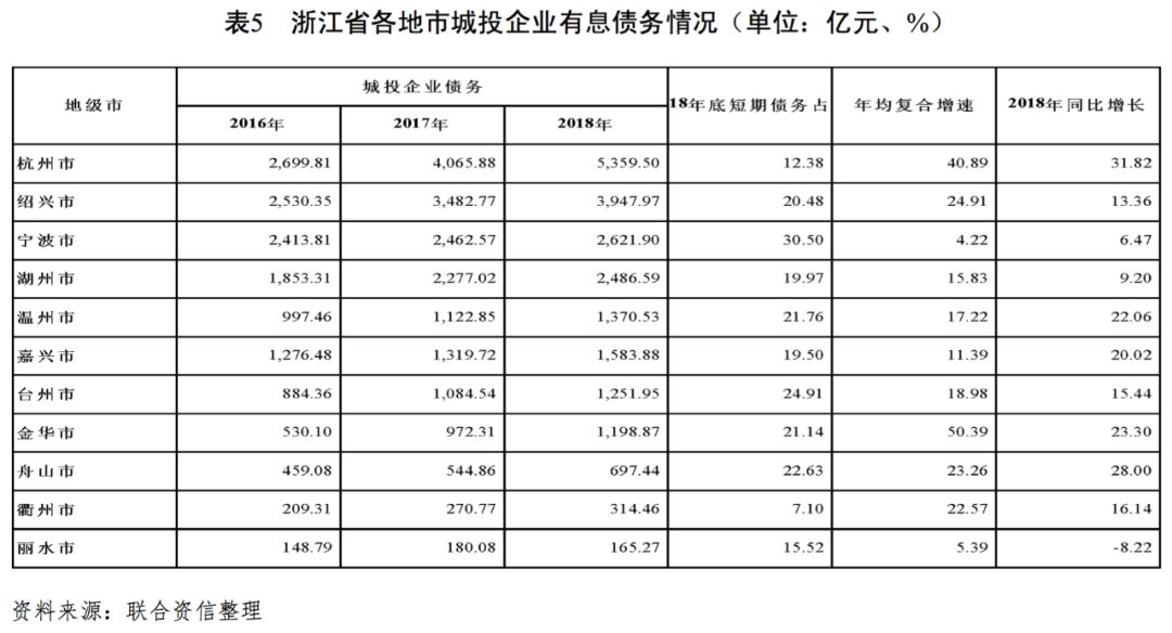 從地區不完全統計債務規模看,杭州市地區不完全統計債務規模最高,2018年底為7641.60億元;其次為紹興市、寧波市和湖州市,地區不完全統計債務分別為4844.17億元、4429.20億元和3179.59億元;溫州市、嘉興市、臺州市、金華市和舟山市地區不完全統計債務在1000—2500億元之間,衢州市和麗水市均低于700億元。從地區不完全統計債務增長率看,杭州市、溫州市、金華市、舟山市和衢州市地區不完全統計債務規模同比增速在20%以上,湖州市地區不完全統計債務同比增長8.0%,其余城市同比增速在10%―20%之間。從城投企業債務與地區不完全統計債務的比值看,舟山市和衢州市政府債務占比大于發債城投企業債務,其余各地市發債城投企業債務占比均大于政府債務,其中湖州市和紹興市發債城投企業債務占地區不完全統計債務比很高,分別為81.50%和78.20%。