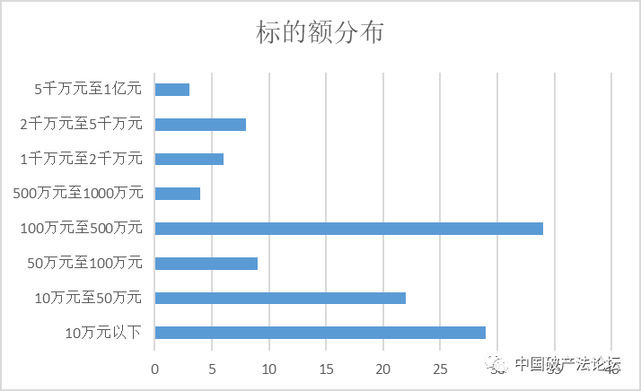 如圖1-5所示,公開檢索的裁判文書中,案件標的普遍不算太高,超過1000萬以上標的的案件約占15%。其中,10萬元以下案件29件,占比25%,10萬元至50萬元案件22件,占比19%,50萬元至100萬元案件9件,占比8%,100萬元至500萬元案件34件,占比30%,500萬元至1000萬元案件4件,占比3%,1千萬元至2千萬元案件6件,占比5%,2千萬元至5千萬元8件,占比7%,5千萬元至1億元案件3件,占比3%。