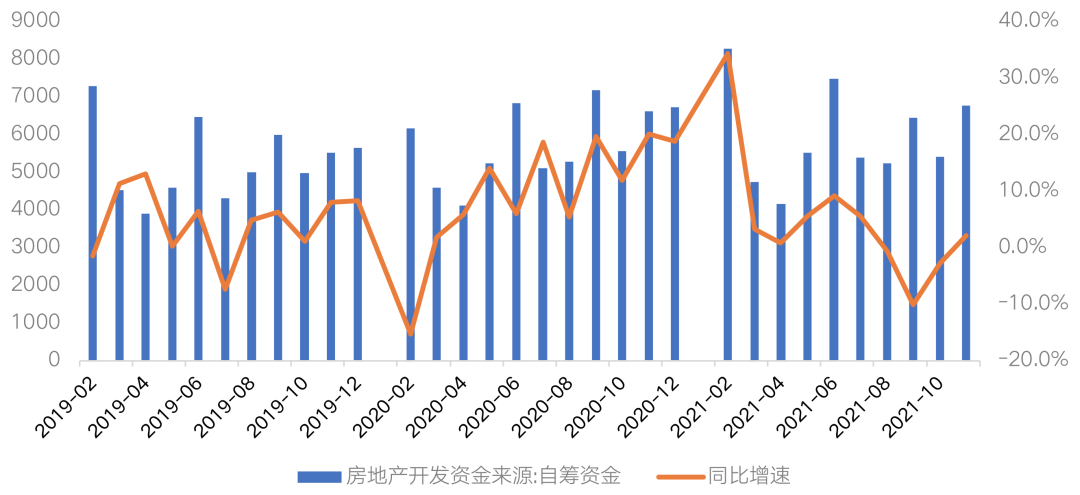 房地產(chǎn)開發(fā)企業(yè)到位資金(自籌資金)數(shù)據(jù)顯示,2021年11月單月值為6761億元,單月資金量年內(nèi)僅次于6月,從增速來看,同比增長2.1%,增速自8月后首次重新回正。
