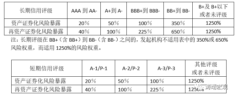 (1)2012年6月7日,銀監(jiān)會(huì)發(fā)布《商業(yè)銀行資本管理辦法(試行)》,明確商業(yè)銀行擁有的債務(wù)工具擁有合格外部評(píng)級(jí)機(jī)構(gòu)提供的債項(xiàng)評(píng)級(jí)結(jié)果的,則該債務(wù)工具的風(fēng)險(xiǎn)權(quán)重將根據(jù)其外部評(píng)級(jí)來(lái)確定。以商業(yè)銀行持有的資產(chǎn)證券化產(chǎn)品為例,相應(yīng)的外部評(píng)級(jí)與對(duì)應(yīng)的風(fēng)險(xiǎn)權(quán)重如下: