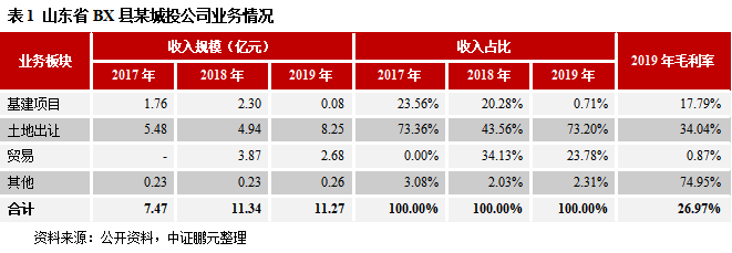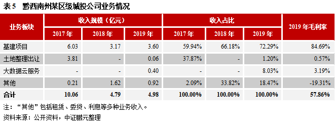 (3)業(yè)務(wù)情況:公司業(yè)務(wù)包括基建項目、土地整理出讓、大數(shù)據(jù)云服務(wù)等板塊,其中基建項目、土地整理出讓均為傳統(tǒng)城投業(yè)務(wù),大數(shù)據(jù)云服務(wù)則屬市場化業(yè)務(wù)。除了上述三大業(yè)務(wù)板塊,公司還有一些其他的業(yè)務(wù)。2017-2019年其他業(yè)務(wù)收入分別為0.21億元、1.62億元、0.92億元,在總收入中的占比分別為2.09%、33.82%、18.47%,毛利率分別為96.00%、-4.54%、-19.31%(見表5)。根據(jù)公司披露的信息,來自于其他業(yè)務(wù)的收入中主要系由子公司鈞鵬建設(shè)的建筑施工所產(chǎn)生的,但2018年、2019年該業(yè)務(wù)產(chǎn)生的收入金額在其他業(yè)務(wù)收入中的占比均不足六成,而其余的收入系由哪些業(yè)務(wù)產(chǎn)生則無法得知。綜上可知,近兩年公司其他業(yè)務(wù)所產(chǎn)生的收入規(guī)模較大,僅次于基建項目,但其毛利率均為負數(shù),且存在部分收入來源難以查明的情形。