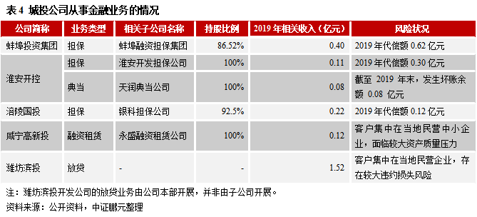 (4)風險提示:弱資質(zhì)城投公司的業(yè)務(wù)經(jīng)驗主要集中在基礎(chǔ)設(shè)施投融資領(lǐng)域和公用事業(yè)領(lǐng)域,其“原生”管理團隊不具備足夠的專業(yè)質(zhì)素,以應(yīng)對金融業(yè)務(wù)的經(jīng)營運作和風險把控,存在較大的因決策失誤導(dǎo)致投資失敗的可能性。而且,即便是重金聘請職業(yè)經(jīng)理人來管理金融業(yè)務(wù),也大概率存在水土不服的情況,較難在城投體制下發(fā)揮其專業(yè)才干。另外,城投公司開展金融業(yè)務(wù)很多時候是響應(yīng)政府號召,履行國企社會責任,比如為當?shù)氐拿駹I企業(yè)、小微企業(yè)等提供擔保、小貸等,但此類服務(wù)對象的抗風險能力普遍較弱,政策環(huán)境、市場環(huán)境一旦出現(xiàn)不利變化,很容易就出現(xiàn)經(jīng)營虧損、資金斷裂、無力償債等情況(見表4),導(dǎo)致城投公司不得不代為償還,進而損害自身的資金流和經(jīng)營效益。