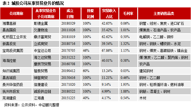 (4)風險提示:貿(mào)易業(yè)務(wù)通常會對弱資質(zhì)城投公司造成大規(guī)模的資金占用,而且利潤極薄,毛利率多在2%以內(nèi)(見表2)。在風控制度和相關(guān)措施不完善的情況下,或者是遭遇周期性經(jīng)濟下行,貿(mào)易業(yè)務(wù)很可能出現(xiàn)虧損,而且由貿(mào)易業(yè)務(wù)形成的應(yīng)收賬款還將面臨很大的壞賬風險。