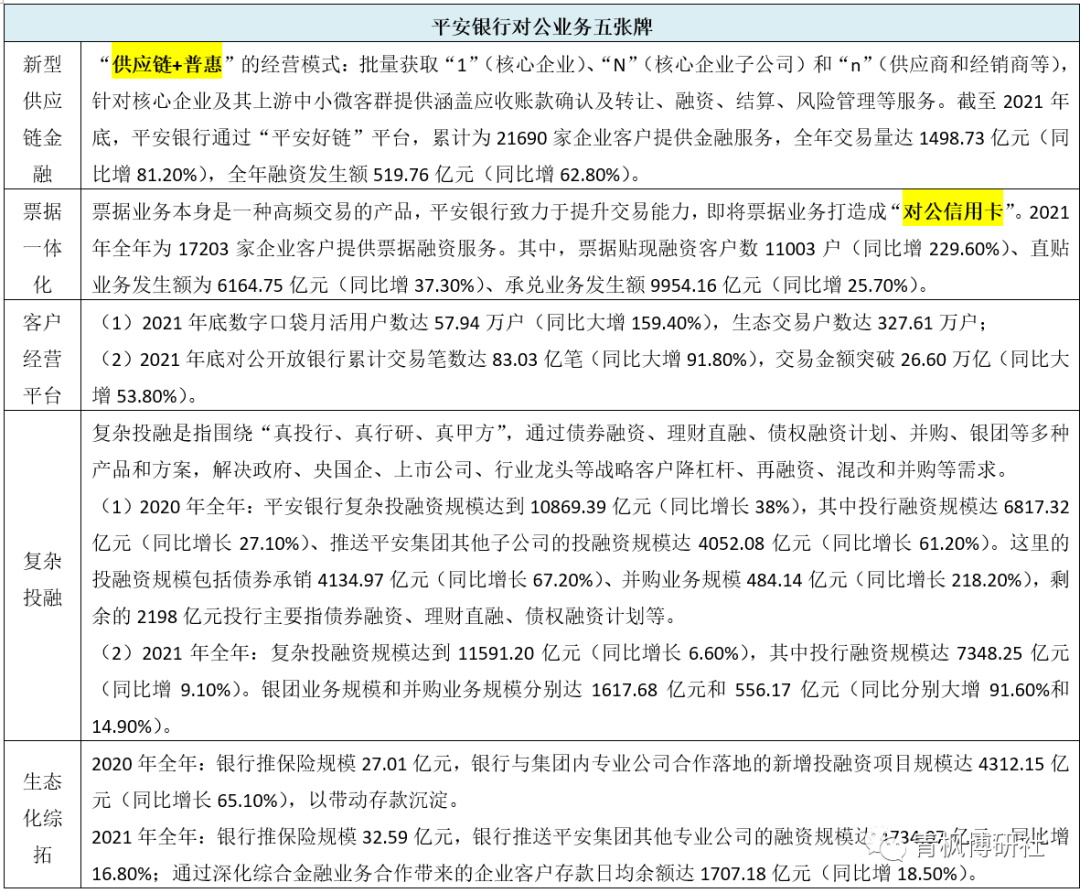 2、2020年以來平安銀行五張牌已經取得一定成效,特別是在供應鏈金融、票據業務和復雜投融業務方面,這里的復雜投融資業務包括投行業務。所謂復雜投融,具體是指圍繞“真投行、真行研、真甲方”,通過債券融資、理財直融、債權融資計劃、并購、銀團等多種產品和方案,解決政府、央國企、上市公司、行業龍頭等戰略客戶降杠桿、再融資、混改和并購等需求。