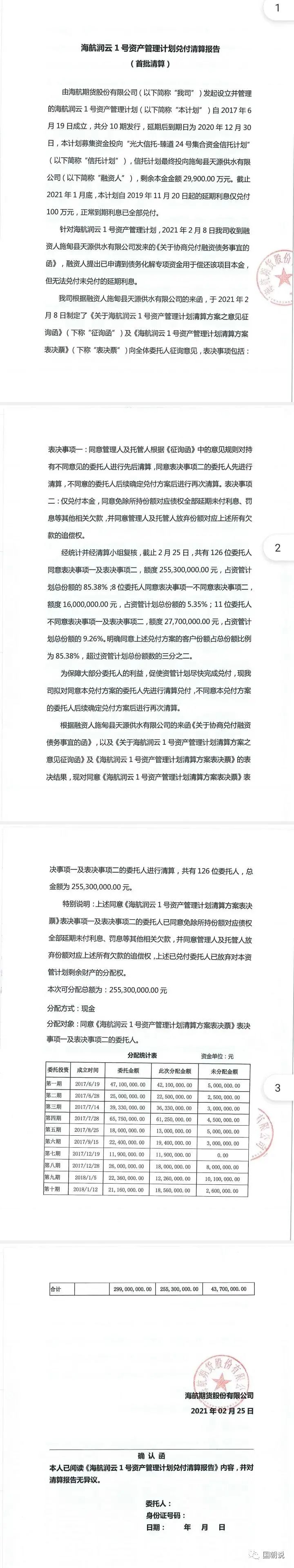 2月25日,海航期貨發(fā)布了《海航潤云1號資產(chǎn)管理計(jì)劃兌付清算報(bào)告(首次清算)》,向我們披露了關(guān)于該項(xiàng)目的最新動態(tài)。