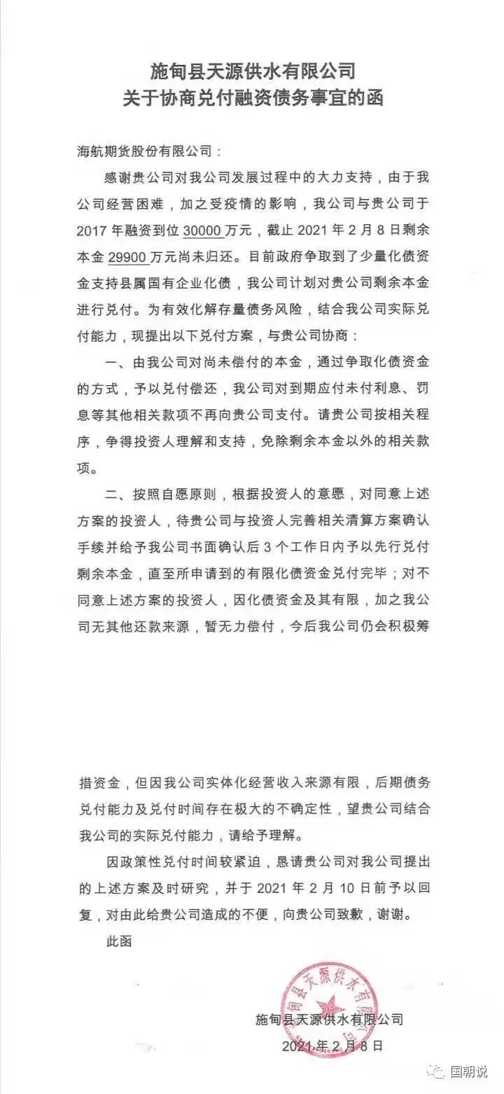 2021年2月8日,施甸縣天源供水有限公司(下稱天源供水)向海航期貨出具的一份《關(guān)于協(xié)商兌付融資債務(wù)事宜的函》。正是這個(gè)函,引發(fā)了市場的關(guān)注,也在此次叩擊著市場對于城投的信仰。