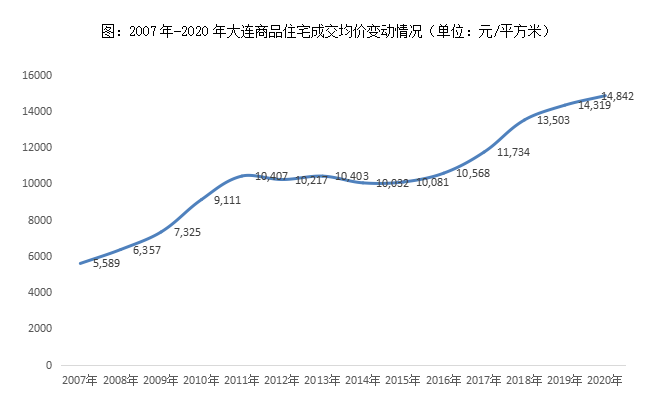 房價層面,大連商品住宅成交均價呈現(xiàn)出“階梯性”爬升特點(diǎn):2017-2011年逐年遞增至房價破萬,2012-2016年高位持穩(wěn),并無太大波動,甚至出現(xiàn)小幅微降趨勢,2017年開始進(jìn)入新一輪爬升,2020年再度達(dá)到階段性高點(diǎn),商品住宅成交均價高位維持在14842元/平方米。
