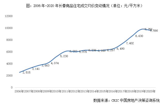長春樓市整體發(fā)展相對平穩(wěn),波動上行,受政策影響較小,即便在全國行情較好的2009年,成交量也未出現(xiàn)顯著提升,基本保持每3年年成交量增長100萬平方米的速度緩步爬升,市場行情相對平穩(wěn),房價同樣“階梯式”上行,目前房價基本“見頂”,2020年甚至有小幅下行趨勢。