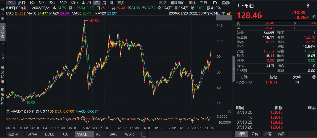受此影響,國(guó)際油價(jià)大漲,美、布期貨開(kāi)盤(pán)漲10%。其中一度升至135美元/桶,WTI期貨突破130美元/桶。