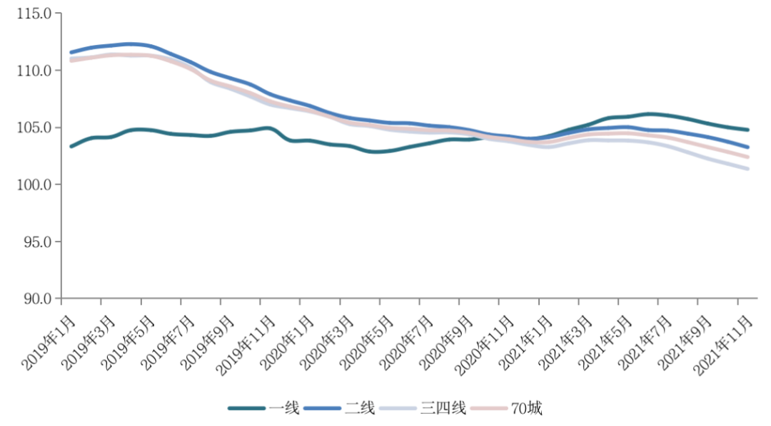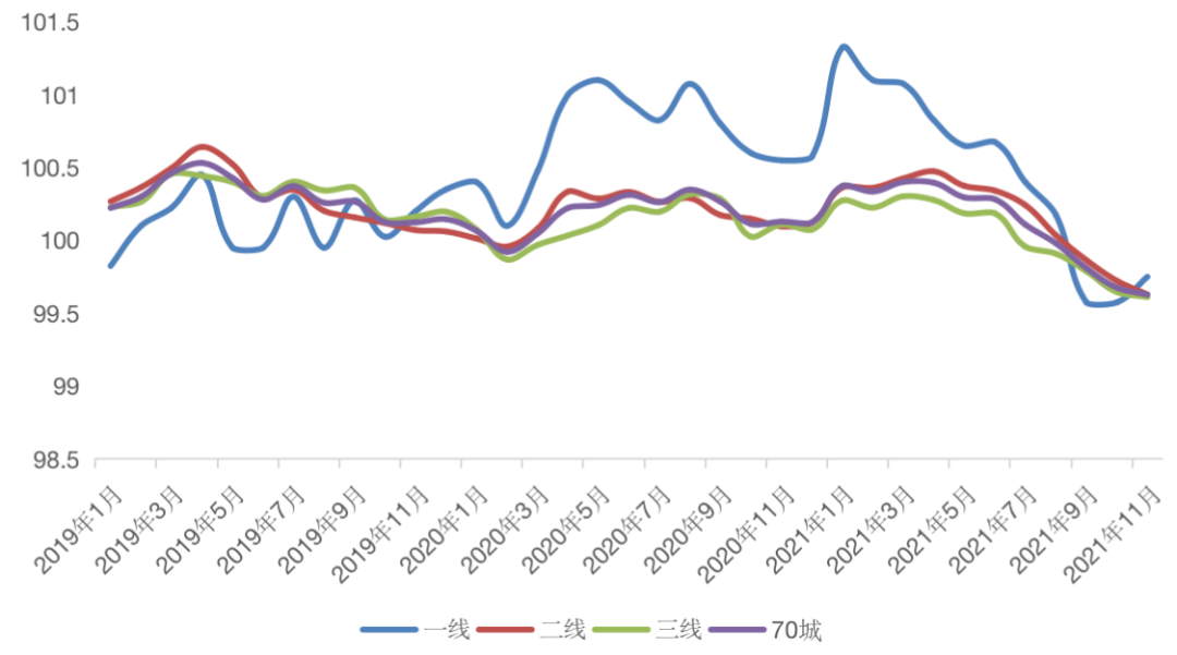 從全國70個大中城市商品住宅銷售價格來看,2021年11月份,70個大中城市商品住宅銷售價格環(huán)比延續(xù)下降態(tài)勢,同比漲幅持續(xù)回落。