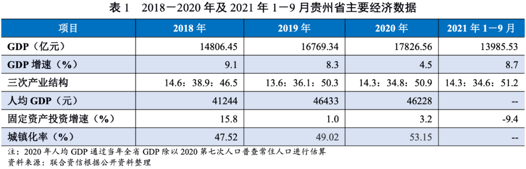 近年來(lái)貴州省經(jīng)濟(jì)保持增長(zhǎng),產(chǎn)業(yè)結(jié)構(gòu)更趨優(yōu)化,但整體經(jīng)濟(jì)總量不大,2020年地區(qū)生產(chǎn)總值占全國(guó)GDP的1.75%,在全國(guó)31個(gè)省、直轄市、自治區(qū)(不含特別行政區(qū))中排名第20位(較2019年躍升2位)。貴州省是傳統(tǒng)的農(nóng)業(yè)大省,近年來(lái)大力發(fā)展特色農(nóng)業(yè),第一產(chǎn)業(yè)在經(jīng)濟(jì)發(fā)展中占據(jù)重要地位;由于第一產(chǎn)業(yè)享受的稅收優(yōu)惠政策較多,總體稅負(fù)水平相對(duì)較低,這一定程度上也影響了貴州省的稅收收入。近年來(lái)伴隨著休閑旅游等的發(fā)展,貴州省第三產(chǎn)業(yè)發(fā)展迅猛,但2019年以來(lái)第三產(chǎn)業(yè)投資負(fù)增長(zhǎng),2020年以來(lái)新冠疫情對(duì)貴州省旅游行業(yè)造成較大沖擊(2020年貴州省旅游總收入5785.09億元,同比下降45.6%),短期內(nèi)對(duì)貴州省經(jīng)濟(jì)發(fā)展帶來(lái)不利影響。