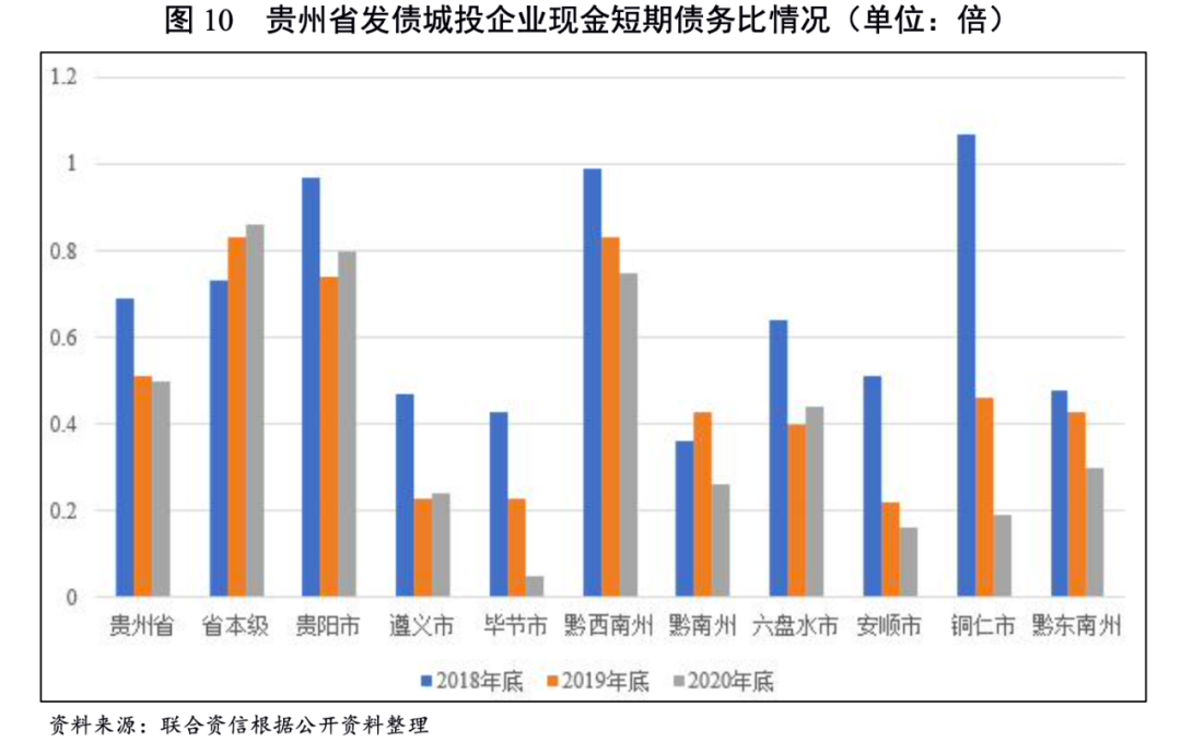 從短期償債能力指標(biāo)看,2018-2020年底,貴州省發(fā)債城投現(xiàn)金短期債務(wù)比逐年下降。其中,省本級(jí)發(fā)債城投現(xiàn)金短期債務(wù)比逐年上升,其余地州市現(xiàn)金短期債務(wù)比均有不同程度下降;2020年底,省本級(jí)和貴陽(yáng)市該指標(biāo)表現(xiàn)較好,除黔西南州外的其余地州市的發(fā)債城投現(xiàn)金短期債務(wù)比不足0.45倍,畢節(jié)市、安順市和銅仁市發(fā)債城投該指標(biāo)低于0.20倍,短期償付壓力較大。