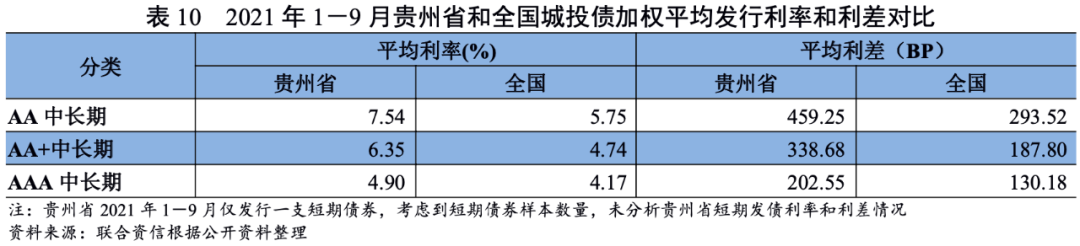 從發(fā)行利差看,2021年1-9月,貴州省城投企業(yè)發(fā)行的AA、AA+及AAA級(jí)中長(zhǎng)期債券發(fā)行利率分別較全國(guó)同級(jí)別城投企業(yè)平均水平高出179BP、161BP和73BP,反映出市場(chǎng)對(duì)貴州省城投債券的風(fēng)險(xiǎn)溢價(jià)高于全國(guó)城投債券。