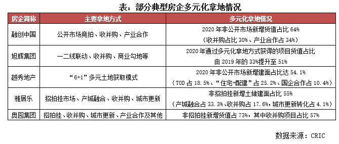 例如旭輝,2020年通過一二線聯動、收并購、商業勾地等多元化拿地方式獲得的項目貨值占比由2019年的33%提升至51%。此外,越秀也不斷完善、豐富“6+1”的多元土地獲取模式,包括TOD、城市更新、“住宅+配建”、國企合作、收并購、產業勾地和公開市場競拍,在2020年新增投資中通過非公開市場獲取的地塊占比達到54.1%,TOD、“住宅+配建”、國企合作增儲模式分別占新增土儲的18.5%、25.2%和10.4%。