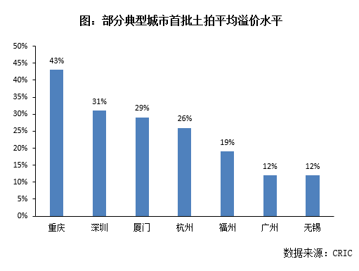 4月底以來,首批集中供地逐步進入高峰期,目前22城中已有過半城市完成首批土拍。從競拍情況來看,在北京、深圳、杭州、重慶等熱點城市,地塊競爭尤為激烈,多數房企不惜犧牲利潤拿到目標地塊。