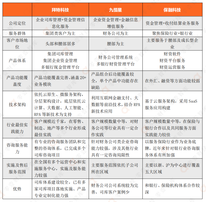 III類則主要為深耕于資金管理、司庫管理市場的技術(shù)性垂直服務商,這一類服務商由于長期專注于企業(yè)集團的資金管理系統(tǒng),在數(shù)字化賦能、維護資金的穩(wěn)健運行層面有著更透徹的服務能力,相較于綜合型企業(yè)服務商雖然在規(guī)模上有一定的差距,但是其差異化優(yōu)勢明顯,在當前司庫管理建設領域有著更為獨到的心得,這類服務廠商代表包括拜特科技、九恒星、保融科技等。