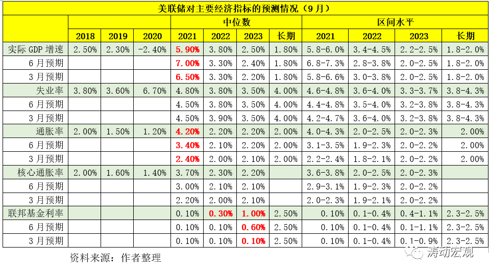 相較于6月議息會議,9月議息會議將2022年和2023年的聯(lián)邦基金目標利率預(yù)期分別由0.10%和0.60%上調(diào)至0.30%和1%,即分別上調(diào)了20BP和40BP。在失業(yè)率預(yù)期上升的情況下,還上調(diào)了2022-2023年的聯(lián)邦基金目標利率預(yù)期,這意味著美聯(lián)儲目前對失業(yè)率的容忍度,這種情況下即便失業(yè)率不夠理想,也不會阻擋美聯(lián)儲加息步伐。