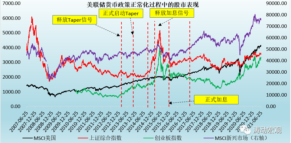 2、而在Taper以及加息的預(yù)期過程中,受資本外流、本幣貶值等因素影響,新興市場股市的波動幅度有所擴大,且傾向于下挫。
