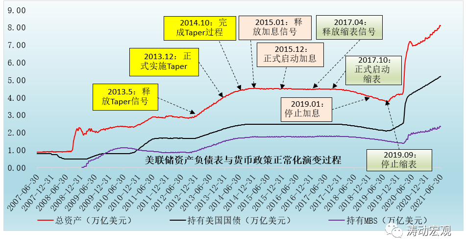 前面已經(jīng)指出,美聯(lián)儲的貨幣政策正?;窂交旧献裱跋蚴袌鲠尫臫aper信號——Taper過程——向市場釋放加息信號——加息——向市場釋放縮表信號——正式縮表”的邏輯脈絡(luò)。