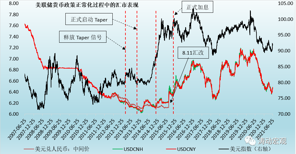 特別是我們看到,在美聯(lián)儲釋放加息預(yù)期信號后,美元指數(shù)的波動幅度明顯放大。這一時期,人民幣在正式啟動Taper之前仍呈現(xiàn)升值態(tài)勢,而在正式啟動Taper(特別是2015年的8.11匯改)后,貶值趨勢明顯且波動幅度明顯加大。