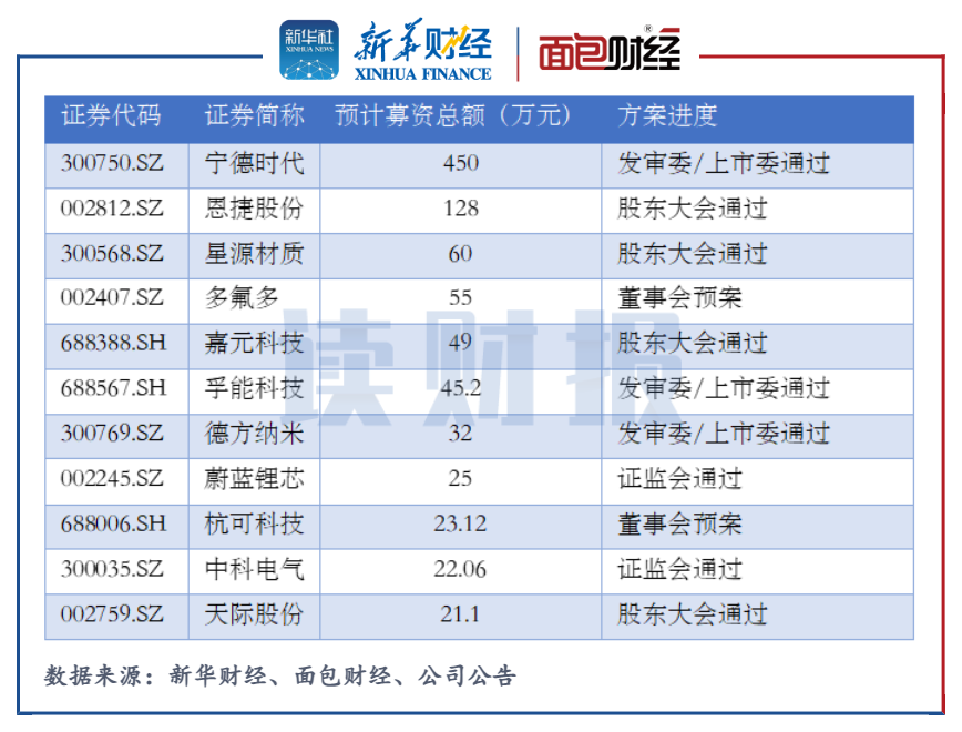 同時(shí),鋰電池板塊中還有約20家上市公司的定增方案正在辦理過程中,合計(jì)的募資總額超950億元。